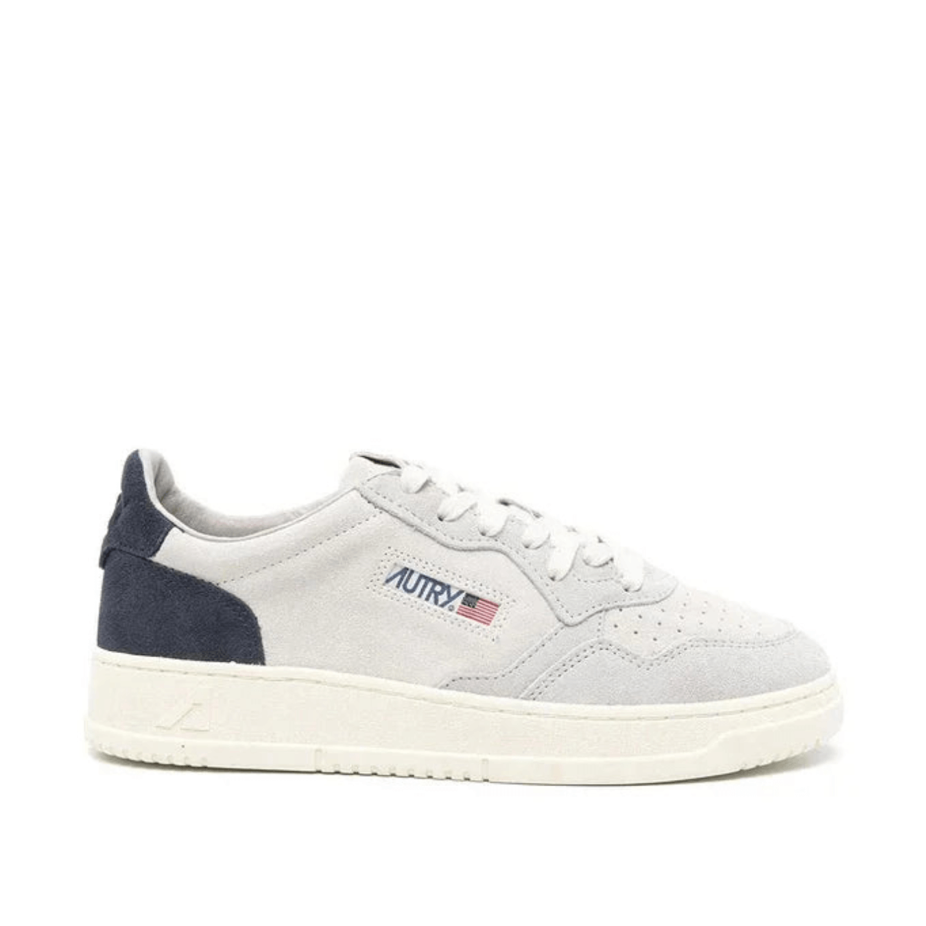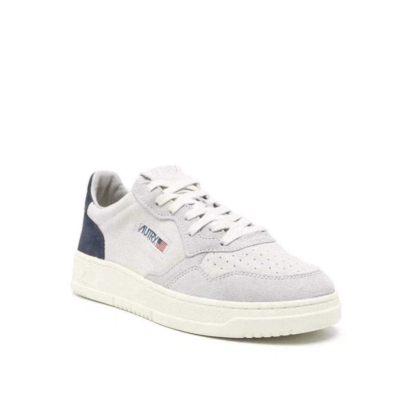 נעלי סניקרס מבית AUTRY, בצבע כחול אפור נמוכות,  עם לוגו סיליקון של Autry, ולשונית עקב מזמש עם לוגו מוטבע.
