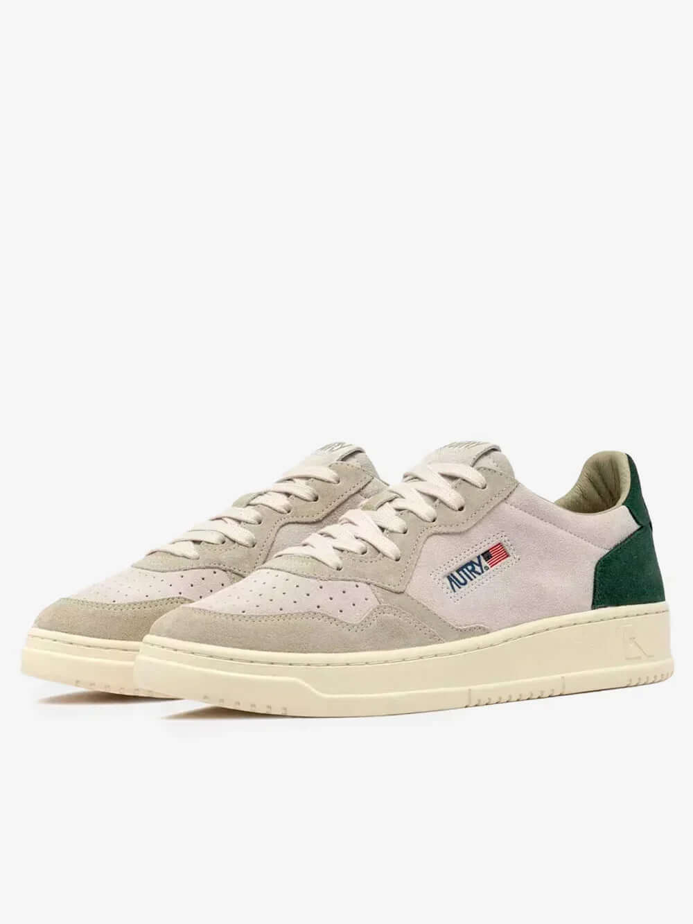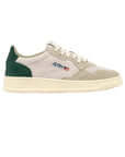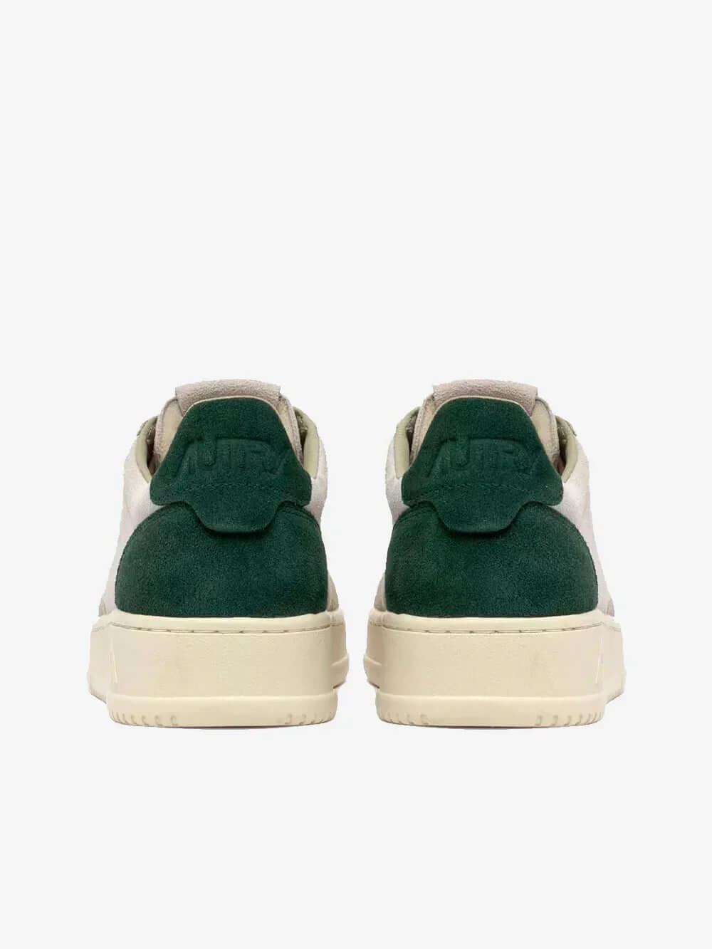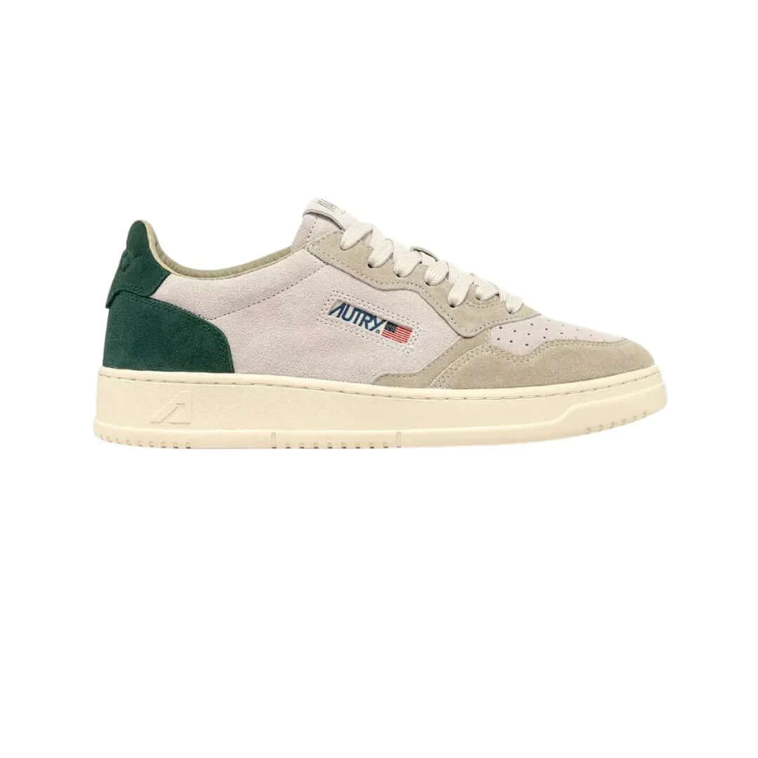 נעלי סניקרס מבית AUTRY, בצבע לבן ירוק נמוכות,  עם לוגו סיליקון של Autry, ולשונית עקב עם לוגו מוטבע.